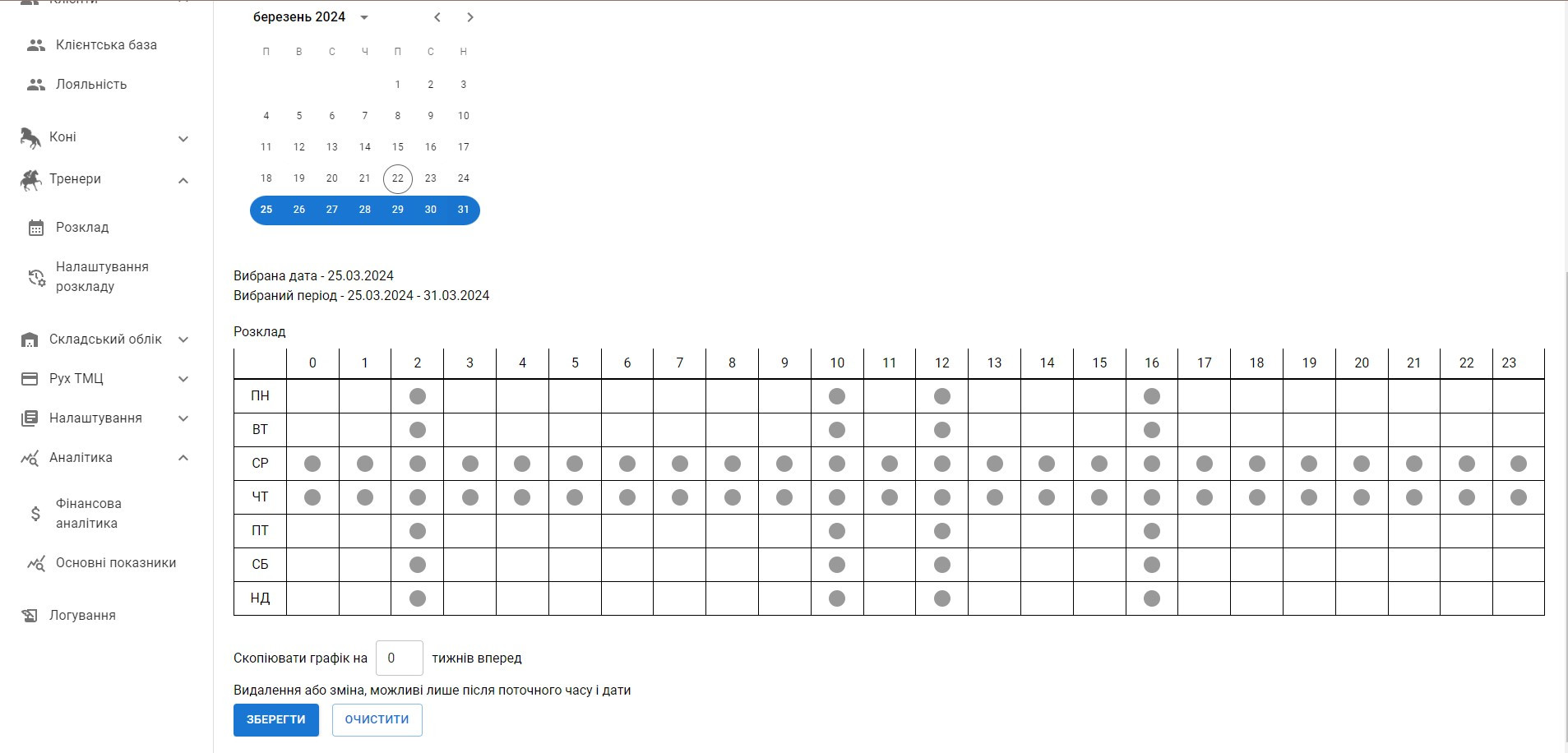 - Flexible system for scheduling trainers' work hours and horse reservations;