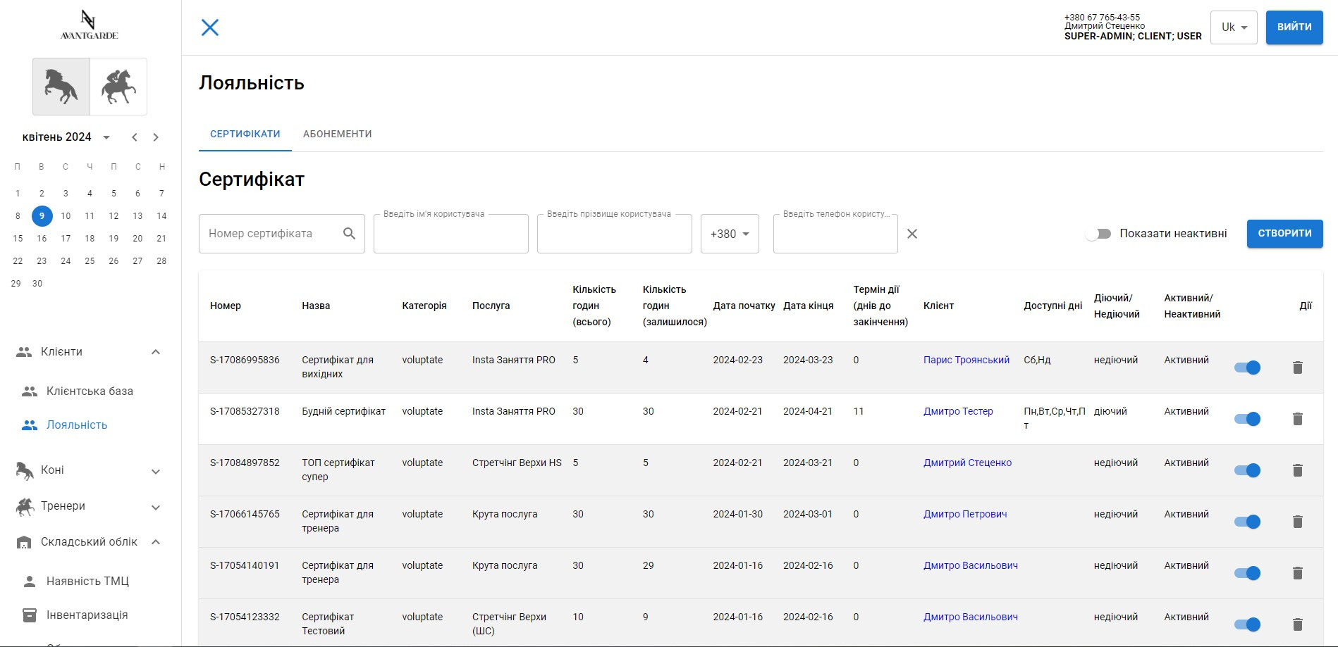 - Role models existing in the system describing specific access rights: owner, administrator, trainer, client, supervisor;
