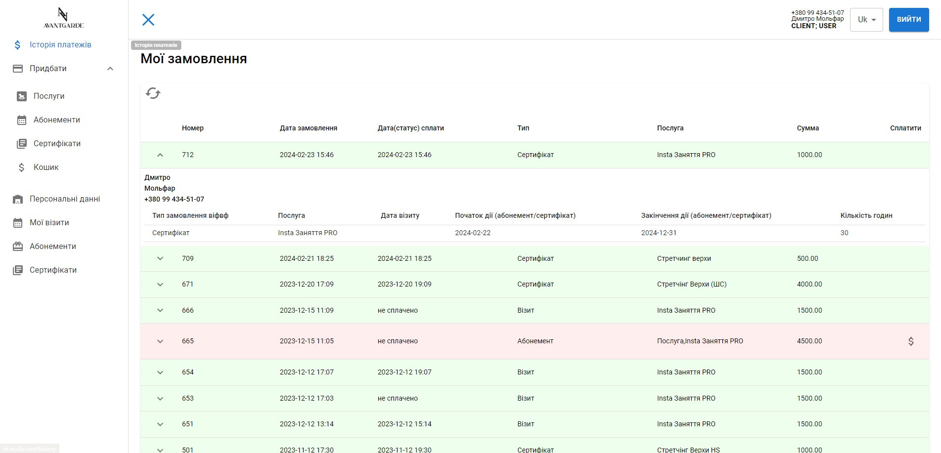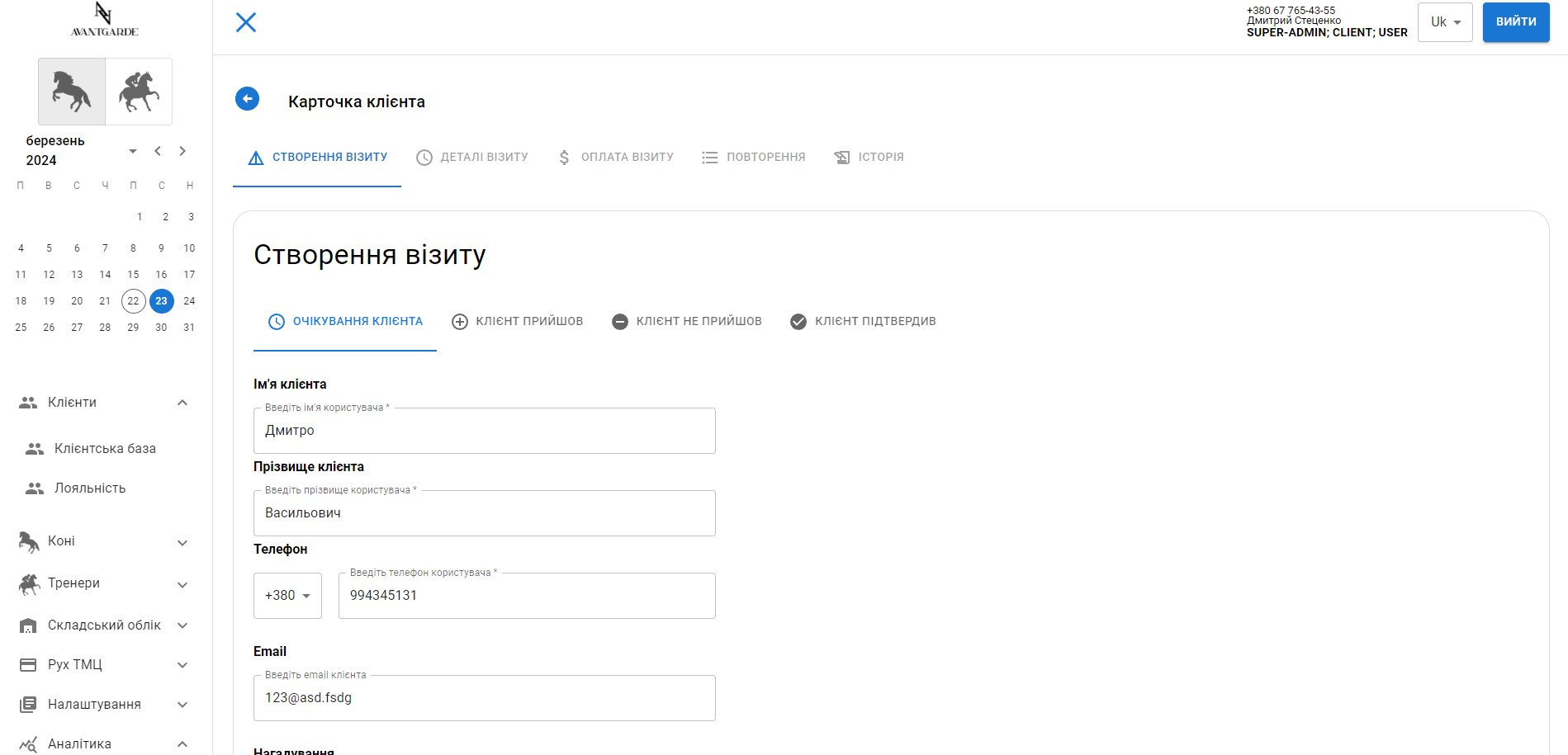 - Booking process available both to the client from their interface and to the administrator. Support for visit statuses implemented;