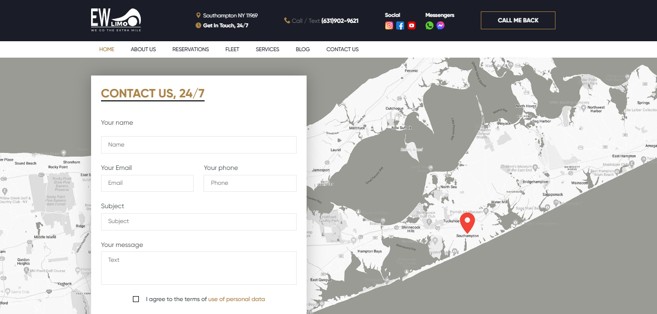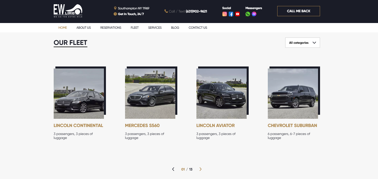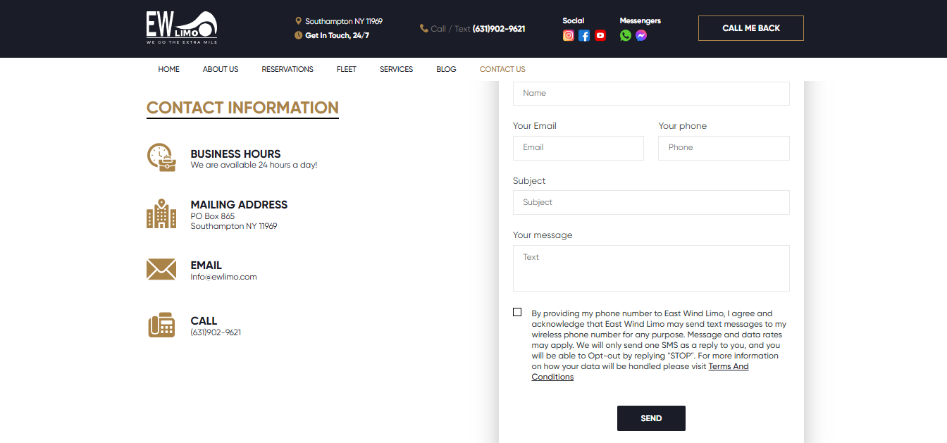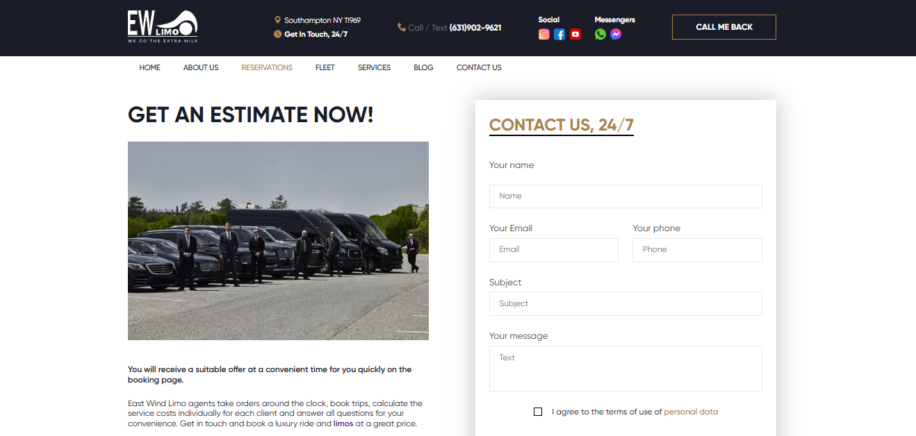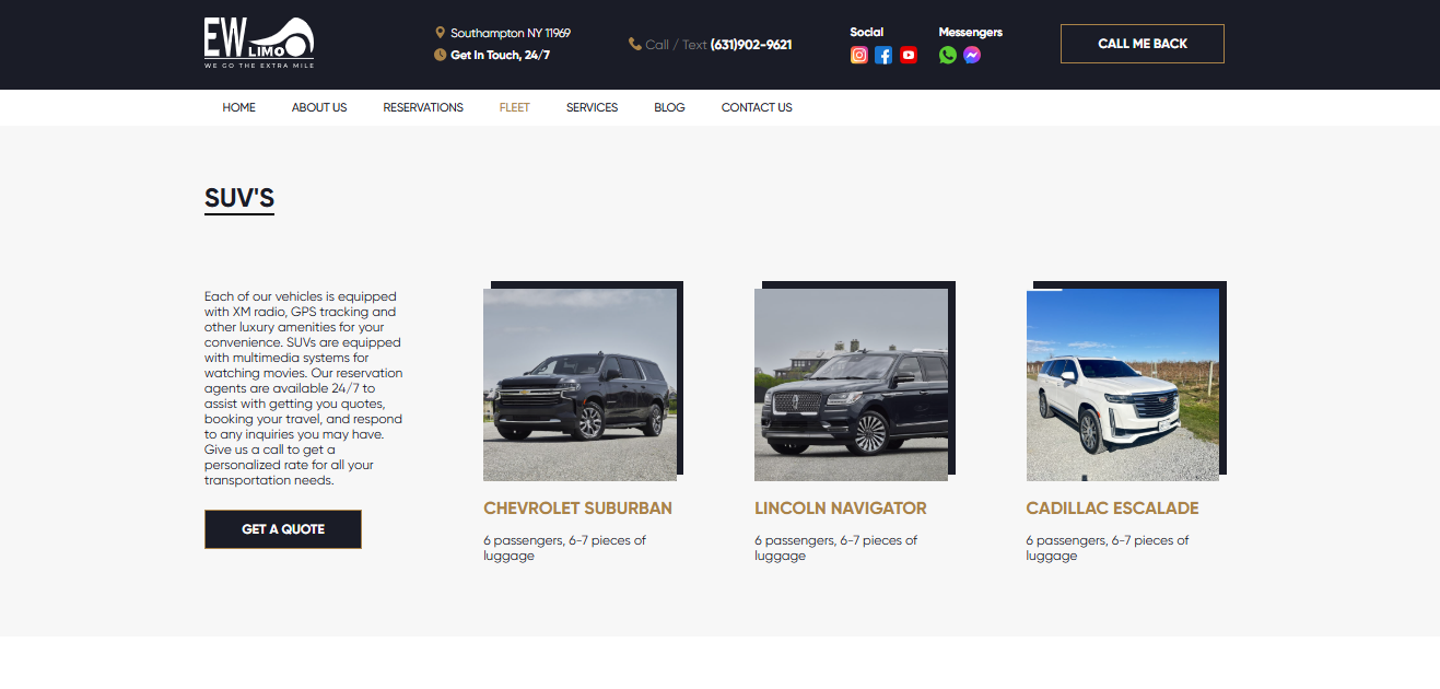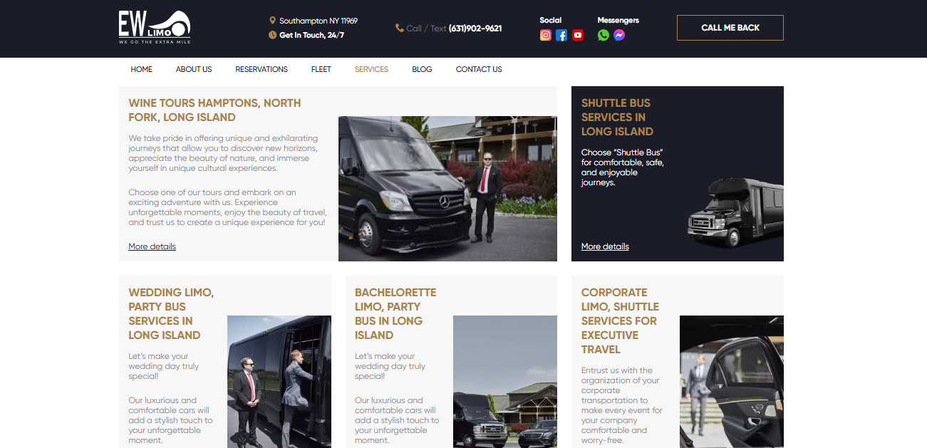 The East Wind Limo website was designed to showcase VIP transportation services in the Hamptons and New York. Key features include: