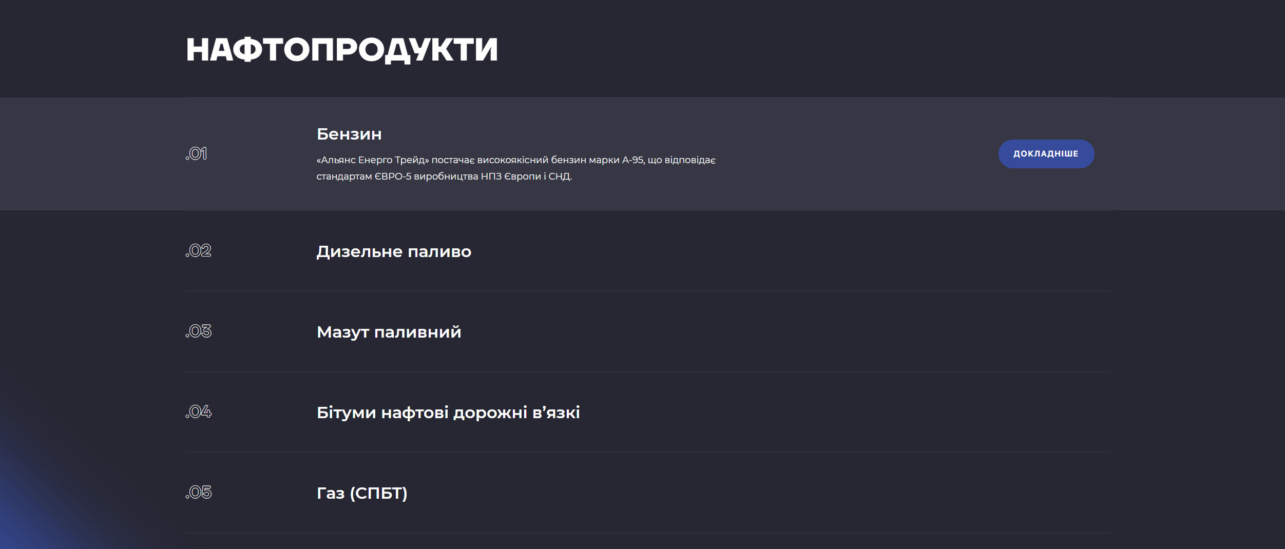 - wholesale of light and dark oil products of domestic and foreign production: gasoline, diesel fuel, liquefied gas, fuel oil and bitumen