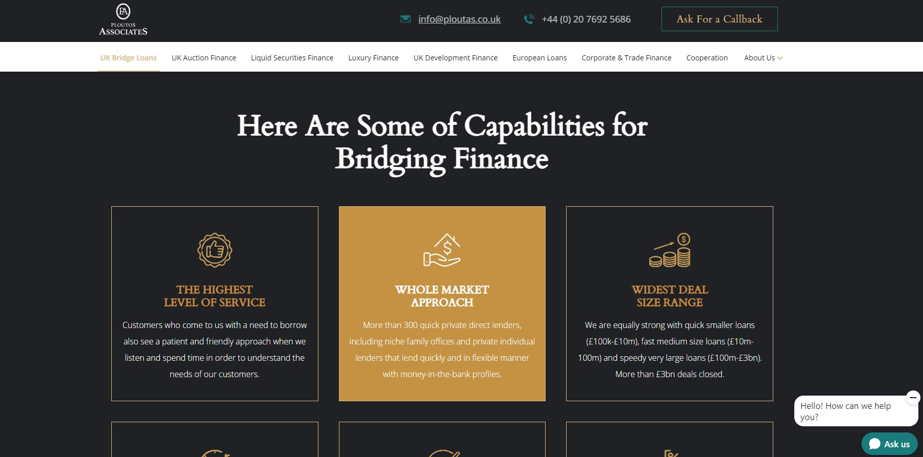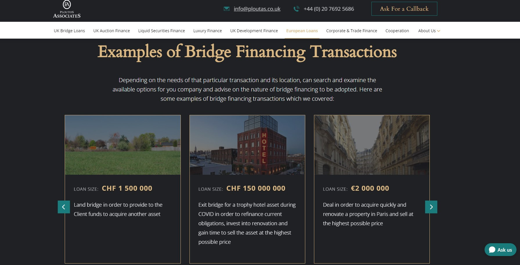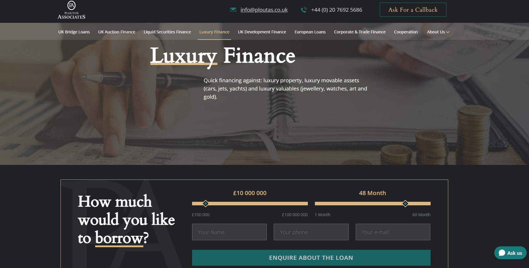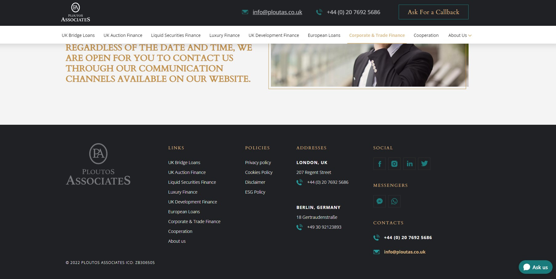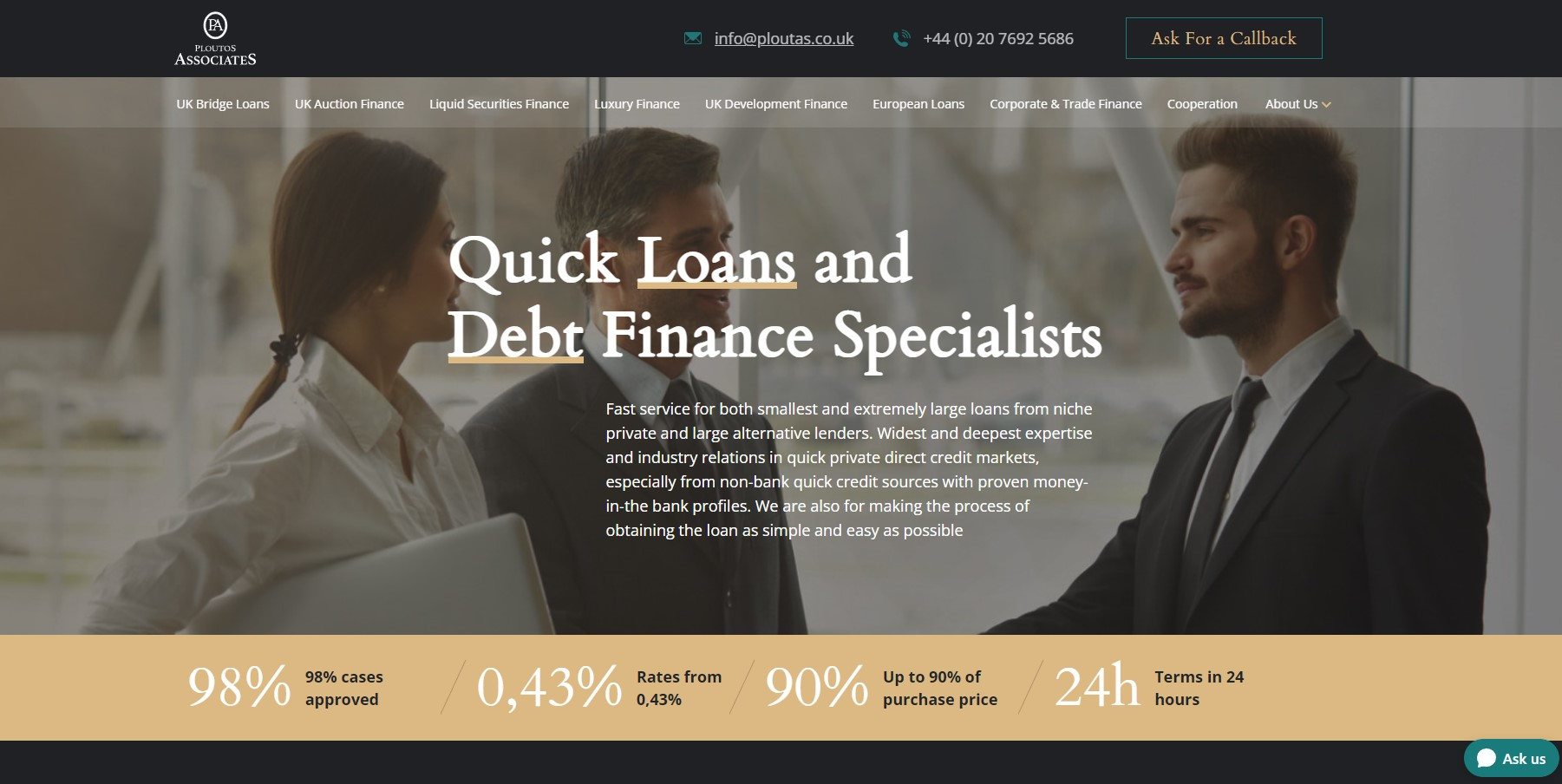 Ploutos Associates, located in London, Great Britain, is primarily focused on assisting the foreign and UK customers in real estate transactions and is a leading provider of capital formation into residential and commercial real estate in the UK and Europe.